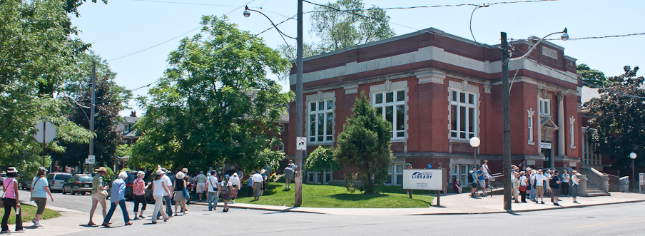 On a hot and sunny Sunday, June 10, the inaugural James Ellis Heritage Toronto Walk took place in the Junction. Three guides, including the Society’s Neil Ross and David Wencer, along with architectural enthusiast Christopher Sears, led sections of the large crowd. Highlights included our Annette Library, and the Junction Shul, Congregation Knesseth Israel, both designed by Junction architect James Ellis. Starting at Keele and Dundas, the guides spent a couple of hours illuminating Junction public and domestic architecture of the 1800s and 1900s on Annette, High Park and Dundas, ending with an inside tour of the Junction Shul. See more pictures and tour information on the Ellis Tour Webpage.