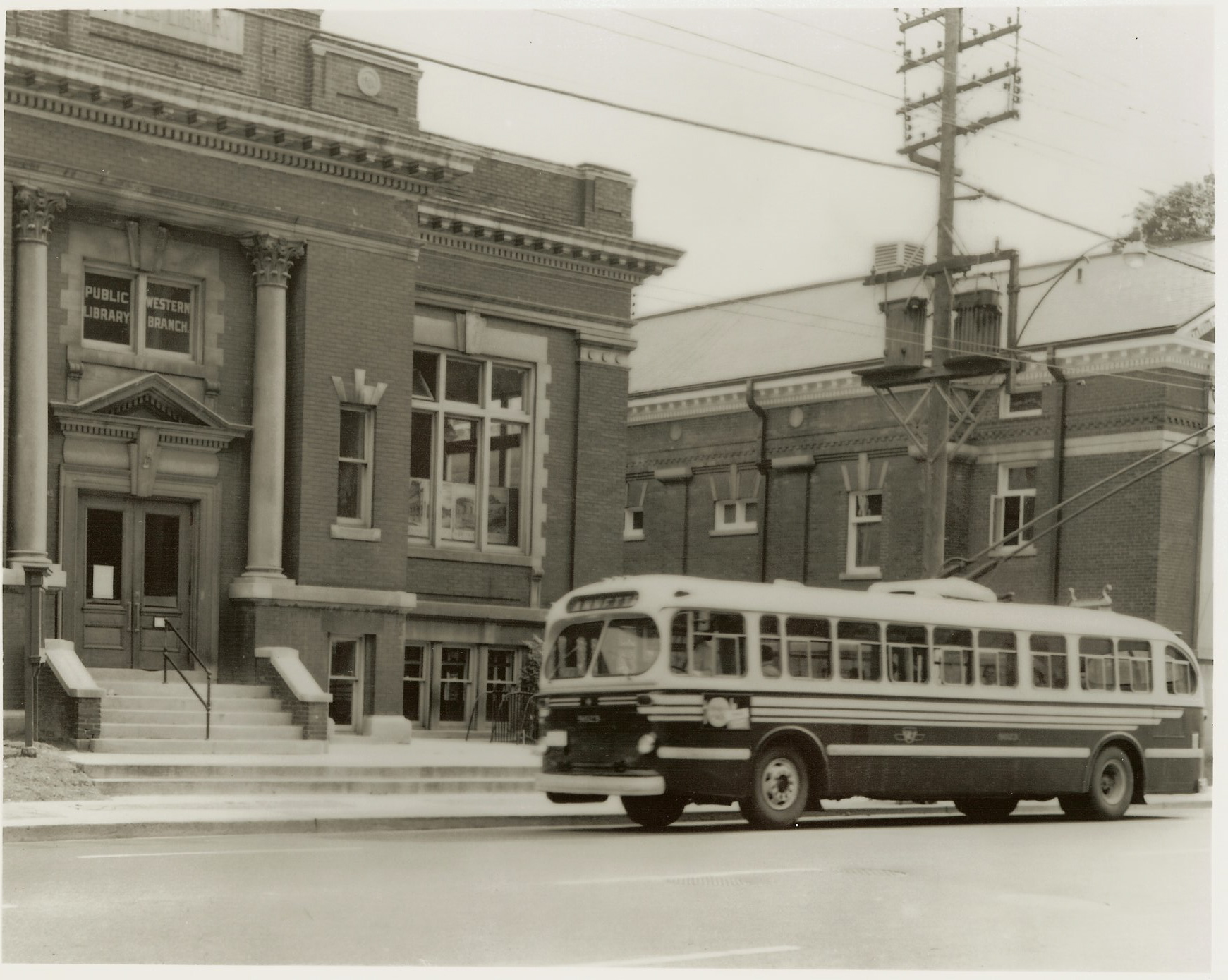 TTC trolley coach 9023 eastbound on Annette Street in front of the Annette Street Public Library. Photographer unknown
