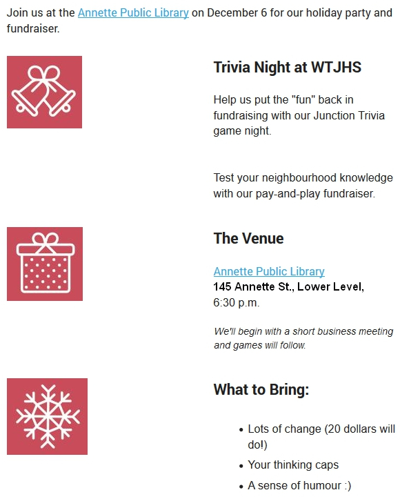 Please bring a treat, snack or other refreshments to share at the December Meeting. If you are able to bring refreshments to the meeting please let us know at junctionhistorical@gmail.com.