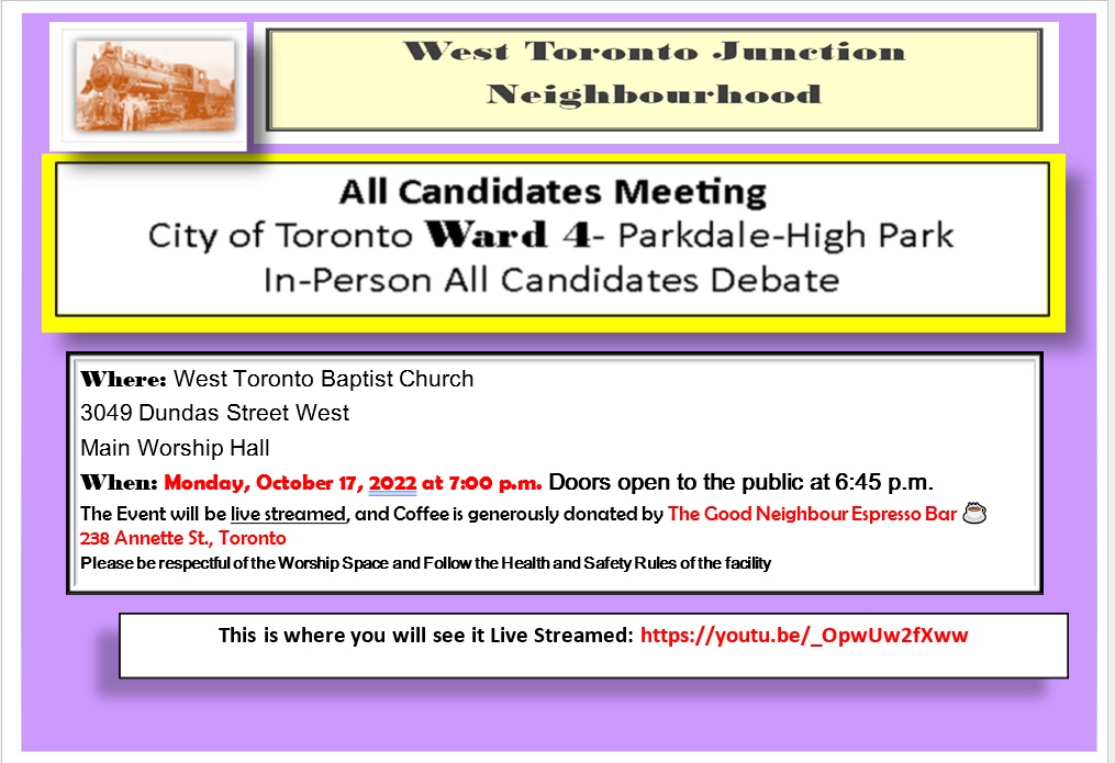 City of Toronto Ward 4 (Parkdale-High Park) In-Person All Candidates Debate Posted on October 17, 2022 by wtjhs This event will be live streamed here: https://youtu.be/_OpwUw2fXww Share this: Click to print (Opens in new window) Print Click to email a link to a friend (Opens in new window) Email TweetShare on TumblrLike Loading... Related