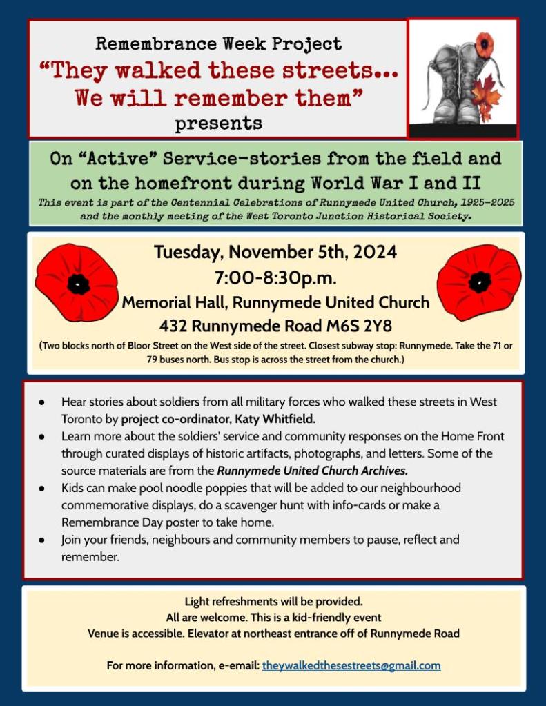 Join us on Tuesday, November 5th, 2024, for a special event presented by the Remembrance Week Project titled On “Active” Service—Stories from the Field and on the Home Front during World War I and II. This unique evening will share stories of soldiers from Toronto’s west-end neighborhoods—Bloor West Village, Junction, High Park, Roncesvalles, and Parkdale—who served in World War I and II but never returned home.