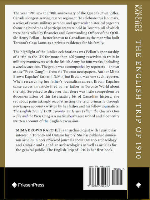 This meticulously researched work brings to life a remarkable chapter in Toronto’s past: the 1910 50th anniversary celebration of the Queen’s Own Rifles, Canada’s longest-serving reserve regiment. Financed by Sir Henry Pellatt—the visionary behind Casa Loma—the celebration culminated in a spectacular four-week military and cultural trip to England for over 600 young reservists and a team of Toronto newspaper reporters, including Mima’s father, J.N.M. (Jim) Brown.