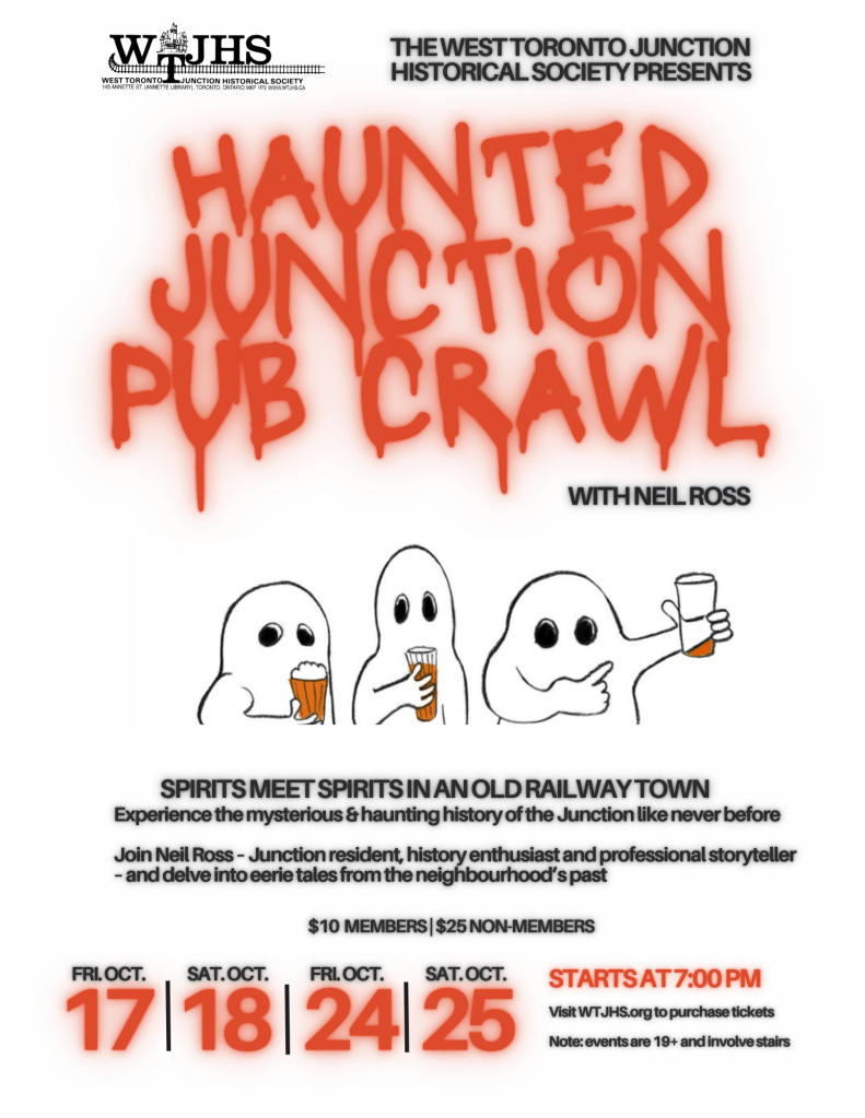 We’re thrilled to be hosting Haunted Junction Pub Crawl events once again–this time around with four dates to choose from. Join us and Junction historian and veteran tour guide Neil Ross for a night of spooky tales from the Junction’s past, told in some of the neighbourhood’s favourite watering holes.