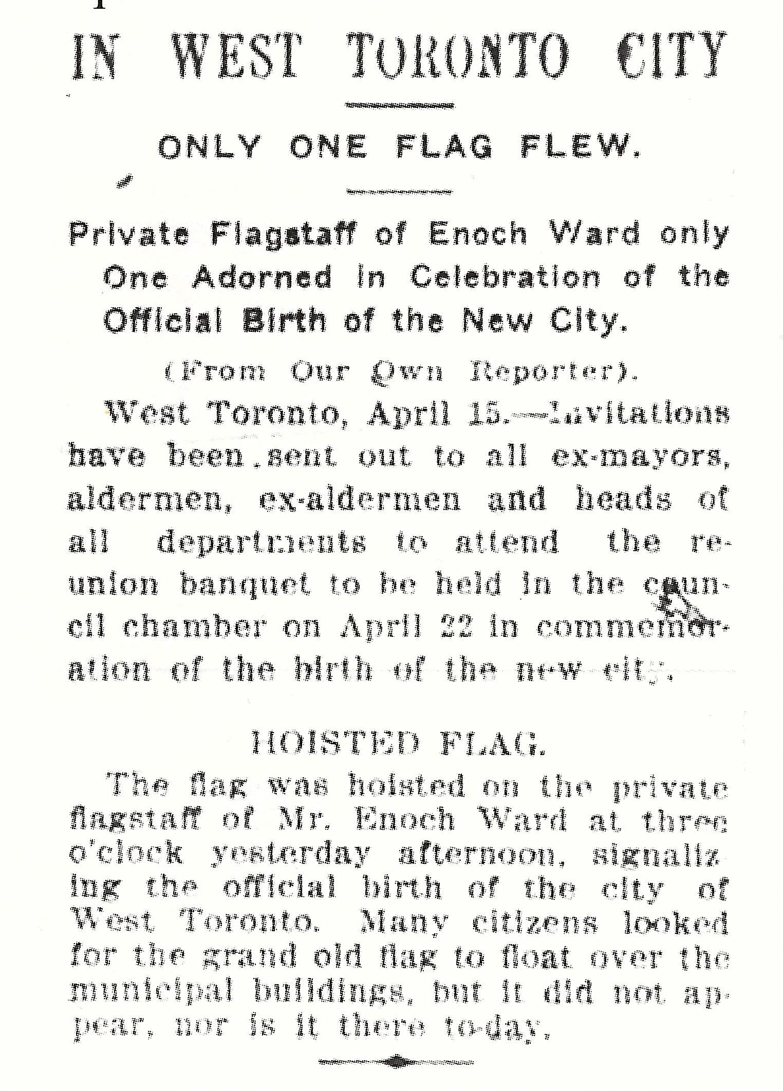 On April 22, 1908, a Commemoration Feast in honor of birth of the city was held at City Hall on Keele Street just south of Dundas Street West, where the Fire Hall is now. Attendees toasted the King and drank to the Dominion of Canada. The Telegram reports that only lemonade was consumed. W.F. Maclean, the local Member of the Provincial Parlaiament, replied to the toast with the declaration that he ‘was a Canadian, nothing but a Canadian, that he would not be anything else if he could.’ Whereupon, every present felt more at ease,” observed the Telegram.