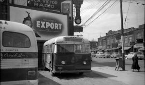 Courtesy Toronto Public Library — West York Coach Lines, garage [parking lot], Dundas St. W., s.w. cor. Pacific Ave., looking n.w. along Dundas St., showing bus #28 in centre. — 1953