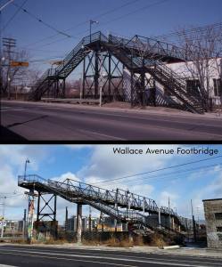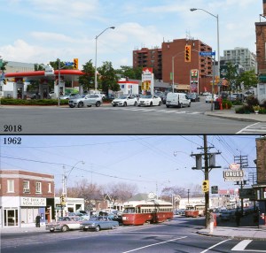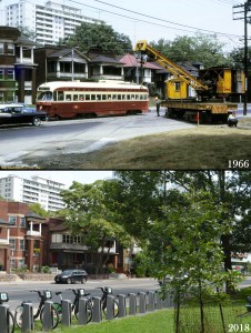 Bloor Street West on the east side of High Park Ave. facing north, 1966 and 2018. In 1966 the yellow crane could be seen removing the loop, 2 years before the Bloor streetcars were removed as well. Today there is an open grassy area and Bike Share Toronto where the loop once was.