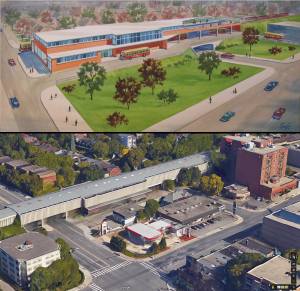 Keele Subway Station, 1960s concept art vs. 2016 Google Earth view.