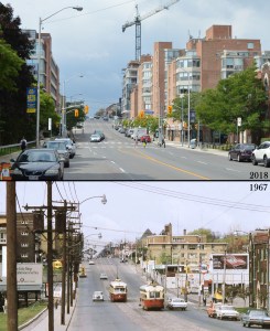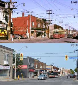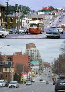 Bloor Street facing east to Keele Street. 1966 and 2017. The streetcar line from Keele to Jane Stations was removed when the Bloor-Danforth Subway extension was opened.