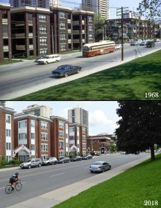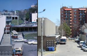Keele Subway Station, looking east. 1968 & 2016. Vilnius Manor now sits where streetcar loop once was. The higher view on the left is now blocked by trees (Dundas Station is visible in the distance.)