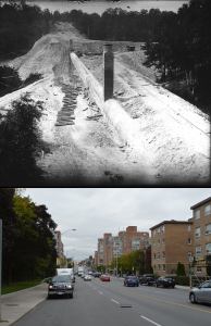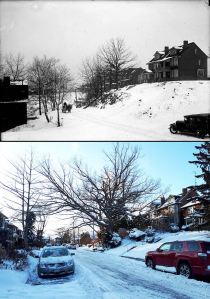 Abbott Ave. facing west towards Indian Road Crescent, 1925 and 2017.The house on the hill is still there, but the one in the valley is gone. The area has been graded with landfill.