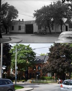 Runnymede Road & St. Clair Ave., facing south-west. Runnymede Roundhouse (1957), now BMO & Walmart (2016).
