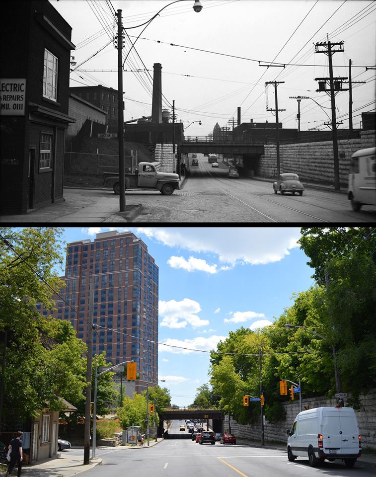Bloor Street West on the east side of High Park Ave. facing north, 1966 and 2018. In 1966 the yellow crane could be seen removing the loop, 2 years before the Bloor streetcars were removed as well. Today there is an open grassy area and Bike Share Toronto where the loop once was.