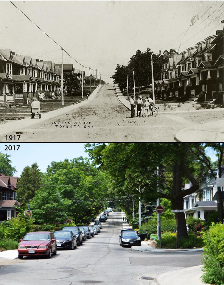 Indian Grove, facing north past Glen Gorden Road. In 1917 the road was still dirt, but in 2017 there are way more trees.
