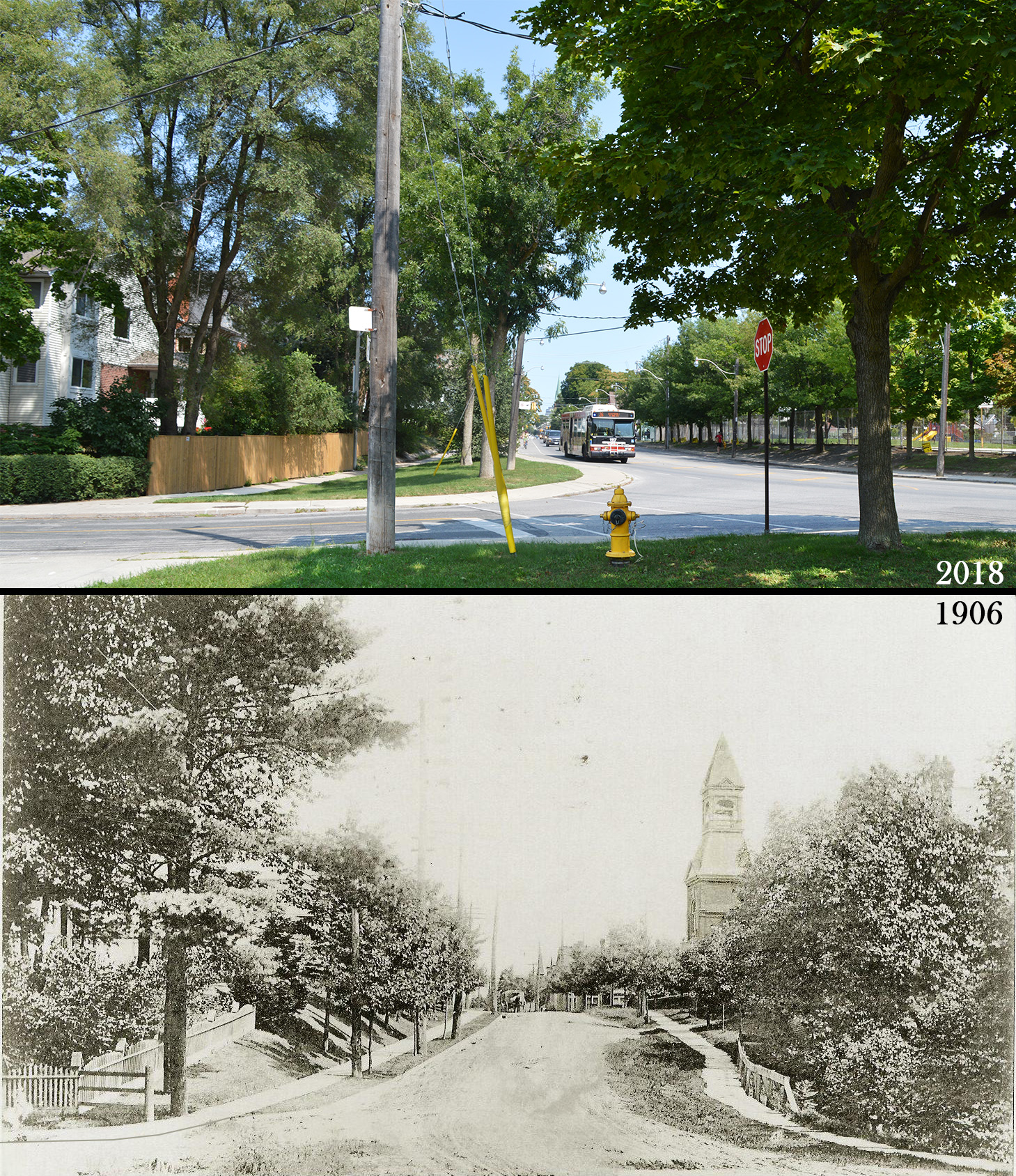 Bloor Street West, facing east from Glendonwynne Road towards High Park in the distance. 1906 and 2017.