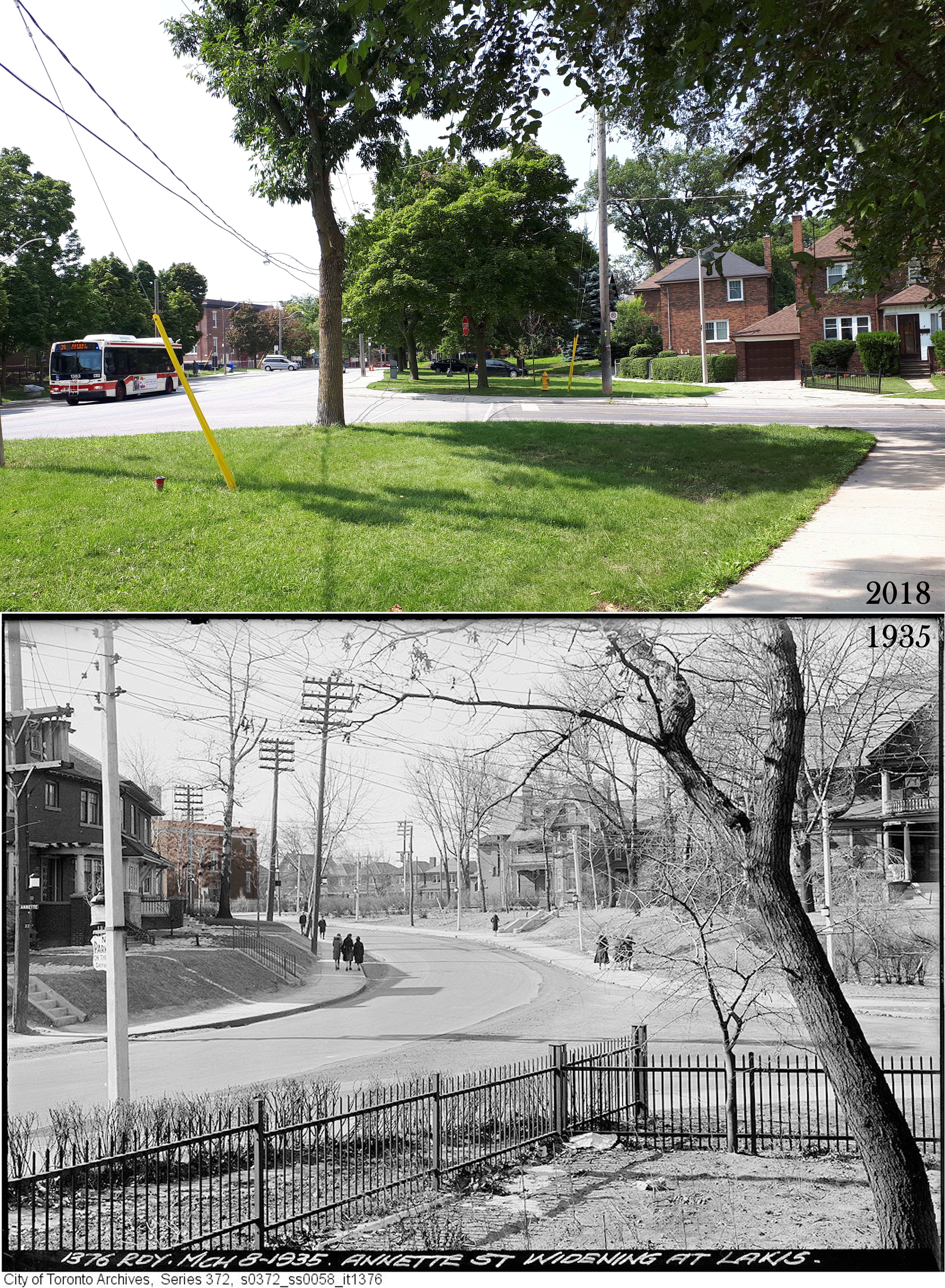 North-west corner of Annette Street and Keele Street, 1974 and 2017.